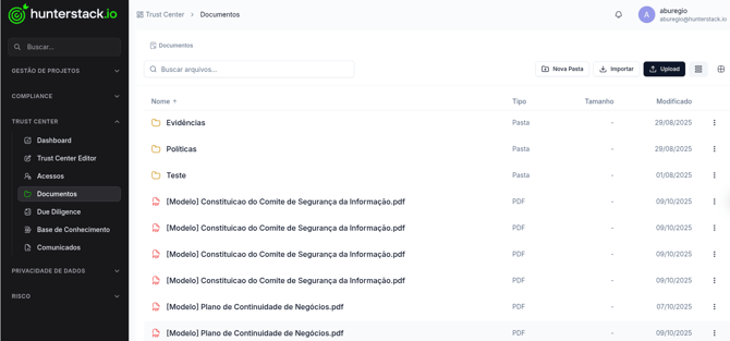 - Navegação: Acesse o módulo principal "Trust Center" e, em seguida, selecione a aba "Documentos".