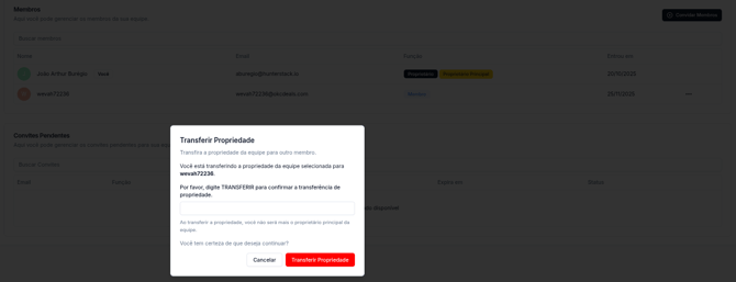 Ao concluir o procedimento abaixo, você perderá imediatamente o status de Proprietário e os privilégios exclusivos associados a essa função. O membro selecionado passará a ter controle total sobre a assinatura, faturamento e gestão da conta. Certifique-se de que essa decisão é definitiva antes de confirmar.