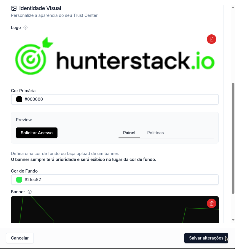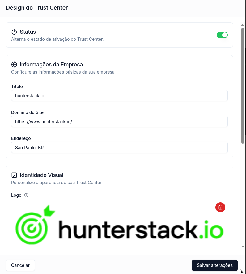 Paleta de Cores: Defina a Cor Primária (que será aplicada a fontes de destaque e botões de ação) e a Cor de Fundo do portal, assegurando que o Trust Center pareça uma extensão natural do seu site corporativo.