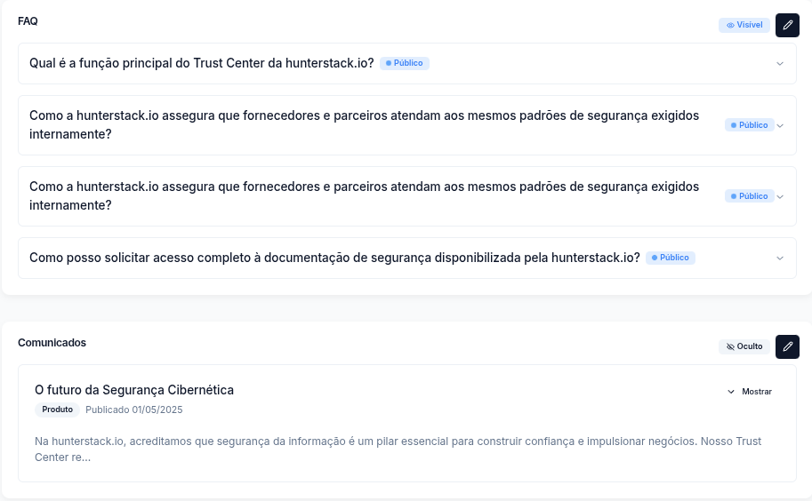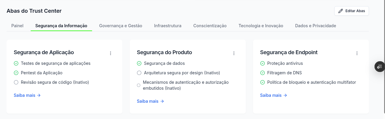 Após definir a identidade visual, é necessário povoar o Trust Center com informações estratégicas que validem a segurança da sua organização. Utilize os ícones de edição (lápis ✏️) em cada bloco para realizar as seguintes configurações: