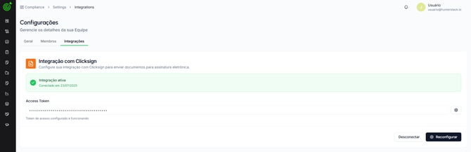 Na tela de integração com a Clicksign, cole o token copiado no campo “Access Token”.