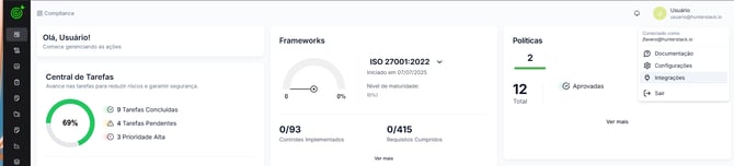 No canto superior direito, clique no nome do seu usuário e selecione "Integrações" no menu suspenso.