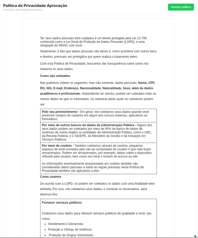 - Após a leitura obrigatória do conteúdo, o usuário deve clicar no botão "Assinar política" para confirmar sua concordância.